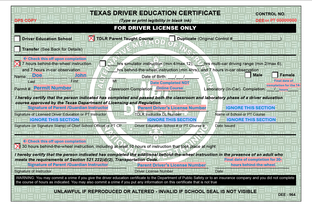 Teens will need to have the parent/guardian who is registered as their designated instructor with the Texas Department of Licensing and Regulation (TDLR) present for the exam as well.